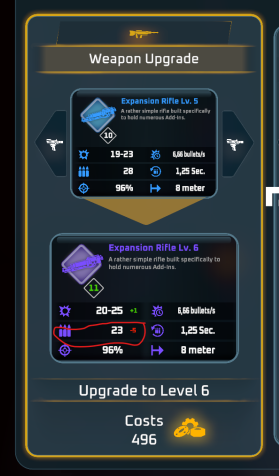 | Description | Upgrading Expansion Rifle from 5 to 6 causes it to lose max ammunition. The values are all correct (I checked with Jan) so there's probably an Add-In or an Inherent Feature at fault. See images or ask Jan about his run. | ||||