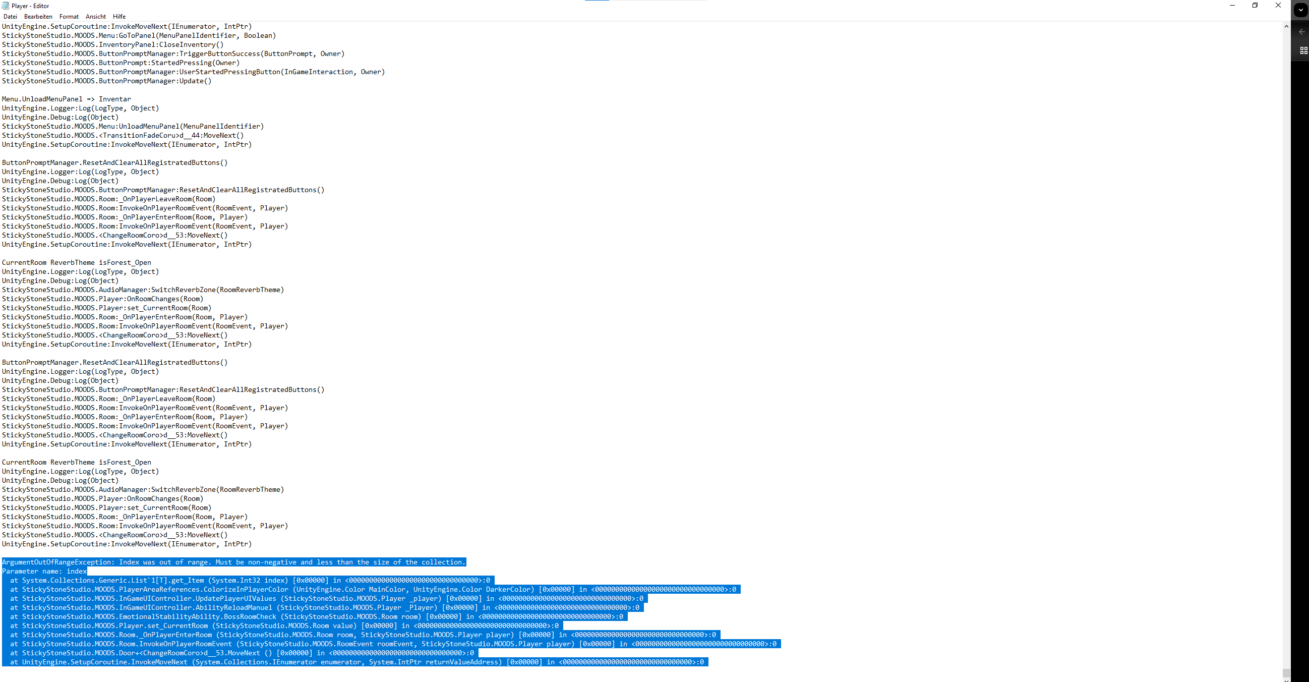 LOG: 02.04.2025 11:50:48 LocalizationManager.ChangeLanguage => Init Localizations for 'GERMAN' and set initial Language. LOG: 02.04.2025 11:50:49 ChangeResolution(3840 x 2160 @ 60Hz) Screen.width: 3840, Screen.hieght: 2160 LOG: 02.04.2025 11:50:50 ChangeFullscreenMode(ExclusiveFullScreen) Screen.fullScreenMode: Windowed LOG: 02.04.2025 11:50:50 NEW GAMESEED: '8C2Q-9VG1' resetSeededCalls: True WARNING: 02.04.2025 11:50:50 GetIsBossEnemy (0# incorrect_settings_in_enemyprefab) is not in EnemyDatabase List! LOG: 02.04.2025 11:50:50 CollectAllEnemyInfoPackagesAssets: EnemyInfoDictionarySO.EnemyInfoDictionary has 54 entries before refreshing ... LOG: 02.04.2025 11:50:50 CollectAllEnemyInfoPackagesAssets: EnemyInfoDictionarySO.EnemyInfoDictionary has 67 entries now! ERROR: 02.04.2025 11:50:50 [Steamworks.NET] SteamAPI_Init() failed. Refer to Valve's documentation or the comment above this line for more information. UnityEngine.Debug:LogError (object,UnityEngine.Object) SteamManager:Awake () (at Assets/Scripts/_Manager/PlatformManagers/SteamManager.cs:131) UnityEngine.GameObject:AddComponent<SteamManager> () SteamManager:get_Instance () (at Assets/Scripts/_Manager/PlatformManagers/SteamManager.cs:40) SteamManager:get_Initialized () (at Assets/Scripts/_Manager/PlatformManagers/SteamManager.cs:27) StickyStoneStudio.MOODS.AchievementManager:InitializeBehavior () (at Assets/Scripts/_Manager/AchievementManager.cs:117) StickyStoneStudio.MOODS.InitializableBehaviour:Initialize () (at Assets/Scripts/_System/InitializableBehaviour.cs:47) StickyStoneStudio.MOODS.GameManager:InitializeBehavior () (at Assets/Scripts/_Manager/GameManager.cs:402) StickyStoneStudio.MOODS.InitializableBehaviour:Initialize () (at Assets/Scripts/_System/InitializableBehaviour.cs:47) StickyStoneStudio.MOODS.GameManager:Awake () (at Assets/Scripts/_Manager/GameManager.cs:349) WARNING: 02.04.2025 11:50:50 MechionaryManager.AddMechionaryGUIDEntry( ME_ENEMY_ANGER_Stationary_Turret_Wut_1e53e27cda94) was already added to list! check code ... WARNING: 02.04.2025 11:50:50 MechionaryManager.AddMechionaryGUIDEntry( ME_ENEMY_ANGER_Stationary_Sniper_Wut_1e53e27cda94) was already added to list! check code ... ERROR: 02.04.2025 11:50:50 SaveGame Profile Loading Error (SerializationException): Failed to get 'DemoStageSwitcher' from GameProfile! Set it as 'False'. Member 'DemoStageSwitcher' was not found. at System.Runtime.Serialization.SerializationInfo.GetElement (System.String name, System.Type& foundType) [0x00020] in <307f99c6ca41457e88f875b482781fa7>:0 at System.Runtime.Serialization.SerializationInfo.GetValue (System.String name, System.Type type) [0x0002e] in <307f99c6ca41457e88f875b482781fa7>:0 at StickyStoneStudio.MOODS.GameProfile.GetValueFromSerializationInfo[T] (System.Runtime.Serialization.SerializationInfo info, System.String name) [0x00000] in C:\Users\Johnny\MOODS\Assets\Scripts\DataModels\SaveGameDataModal.cs:575 UnityEngine.Debug:LogError (object) StickyStoneStudio.MOODS.GameProfile:GetValueFromSerializationInfo<bool> (System.Runtime.Serialization.SerializationInfo,string) (at Assets/Scripts/DataModels/SaveGameDataModal.cs:586) StickyStoneStudio.MOODS.GameProfile:.ctor (System.Runtime.Serialization.SerializationInfo,System.Runtime.Serialization.StreamingContext) (at Assets/Scripts/DataModels/SaveGameDataModal.cs:112) System.Runtime.Serialization.Formatters.Binary.BinaryFormatter:Deserialize (System.IO.Stream) StickyStoneStudio.MOODS.SaveManager:CollectSaveGames () (at Assets/Scripts/_Manager/SaveManager.cs:78) StickyStoneStudio.MOODS.SaveManager:InitializeBehavior () (at Assets/Scripts/_Manager/SaveManager.cs:37) StickyStoneStudio.MOODS.InitializableBehaviour:Initialize () (at Assets/Scripts/_System/InitializableBehaviour.cs:47) StickyStoneStudio.MOODS.GameManager:InitializeBehavior () (at Assets/Scripts/_Manager/GameManager.cs:419) StickyStoneStudio.MOODS.InitializableBehaviour:Initialize () (at Assets/Scripts/_System/InitializableBehaviour.cs:47) StickyStoneStudio.MOODS.GameManager:Awake () (at Assets/Scripts/_Manager/GameManager.cs:349) ERROR: 02.04.2025 11:50:50 SaveGame Profile Loading Error (SerializationException): Failed to get 'DemoStageSwitcher' from GameProfile! Set it as 'False'. Member 'DemoStageSwitcher' was not found. at System.Runtime.Serialization.SerializationInfo.GetElement (System.String name, System.Type& foundType) [0x00020] in <307f99c6ca41457e88f875b482781fa7>:0 at System.Runtime.Serialization.SerializationInfo.GetValue (System.String name, System.Type type) [0x0002e] in <307f99c6ca41457e88f875b482781fa7>:0 at StickyStoneStudio.MOODS.GameProfile.GetValueFromSerializationInfo[T] (System.Runtime.Serialization.SerializationInfo info, System.String name) [0x00000] in C:\Users\Johnny\MOODS\Assets\Scripts\DataModels\SaveGameDataModal.cs:575 UnityEngine.Debug:LogError (object) StickyStoneStudio.MOODS.GameProfile:GetValueFromSerializationInfo<bool> (System.Runtime.Serialization.SerializationInfo,string) (at Assets/Scripts/DataModels/SaveGameDataModal.cs:586) StickyStoneStudio.MOODS.GameProfile:.ctor (System.Runtime.Serialization.SerializationInfo,System.Runtime.Serialization.StreamingContext) (at Assets/Scripts/DataModels/SaveGameDataModal.cs:112) System.Runtime.Serialization.Formatters.Binary.BinaryFormatter:Deserialize (System.IO.Stream) StickyStoneStudio.MOODS.SaveManager:CollectSaveGames () (at Assets/Scripts/_Manager/SaveManager.cs:78) StickyStoneStudio.MOODS.SaveManager:InitializeBehavior () (at Assets/Scripts/_Manager/SaveManager.cs:37) StickyStoneStudio.MOODS.InitializableBehaviour:Initialize () (at Assets/Scripts/_System/InitializableBehaviour.cs:47) StickyStoneStudio.MOODS.GameManager:InitializeBehavior () (at Assets/Scripts/_Manager/GameManager.cs:419) StickyStoneStudio.MOODS.InitializableBehaviour:Initialize () (at Assets/Scripts/_System/InitializableBehaviour.cs:47) StickyStoneStudio.MOODS.GameManager:Awake () (at Assets/Scripts/_Manager/GameManager.cs:349) ERROR: 02.04.2025 11:50:50 SaveGame Profil